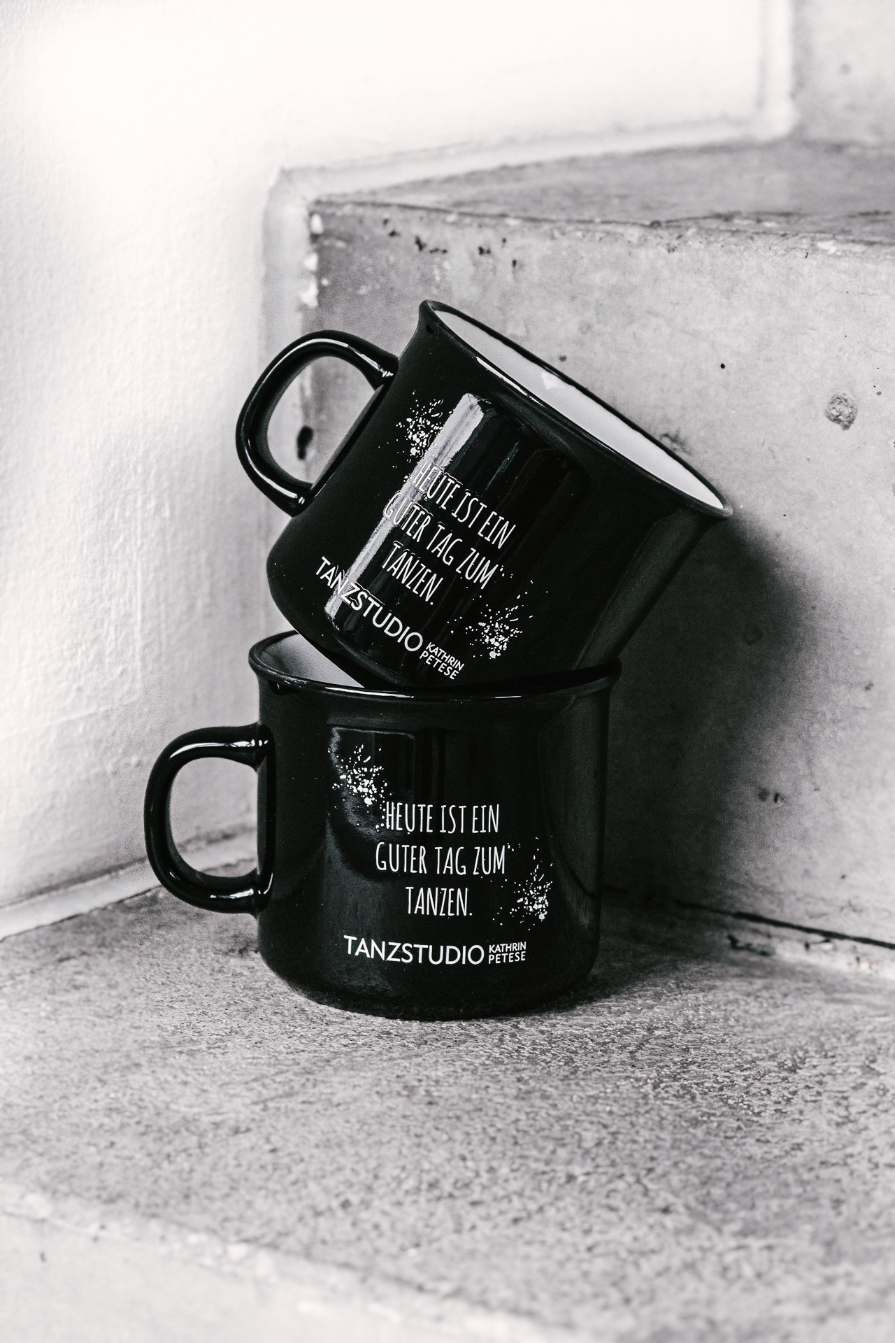 Heute ist ein guter Tag zum Tanzen. Und zum Teetrinken. Oder Kaffee. Oder Kakao. Was auch immer. Schwarz mit weißem Print. Die Tassen und der Druck sind geeignet für Geschirrspüler.